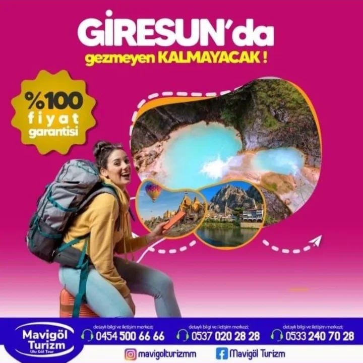 Mavi Göl Turizm merkezi Giresun olan bir tur firmasıdır. Konusunda uzman kadrosu, kaliteli hizmet anlayışıyla yurtiçi kültür turları düzenlemektedir. Bu turları düzenlerken ilkemiz misafirlerimize en kaliteli hizmeti sunmaktır.